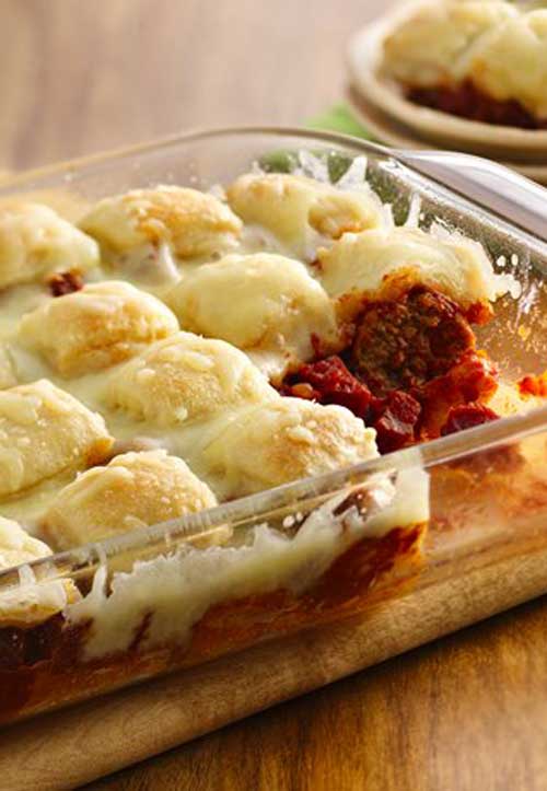 - In large microwavable bowl, place meatballs and pizza sauce. Cover; microwave on Medium-High (70%) 5 to 8 minutes or until sauce is bubbly and meatballs are thawed. Stir in pepperoni. Pour over dough pieces in dish; sprinkle with Parmesan cheese. Arrange remaining dough pieces over cheese.