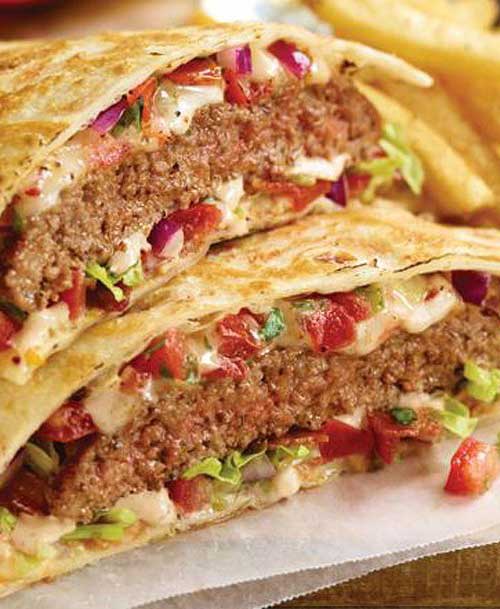- Lay tortillas out then spread 1/4 of the seasoned ground beef on one half of each tortilla. Top with toppings of choice then fold over tortilla.