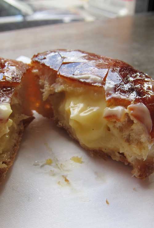 - Spoon the filling into a piping bag fitted with a wide nozzle. Use the nozzle to make a hole in the side of each doughnut and pipe a generous amount of filling into the centre.